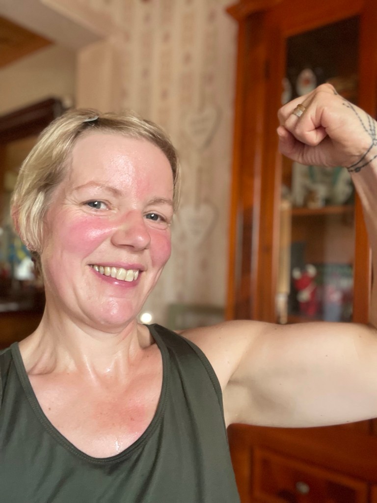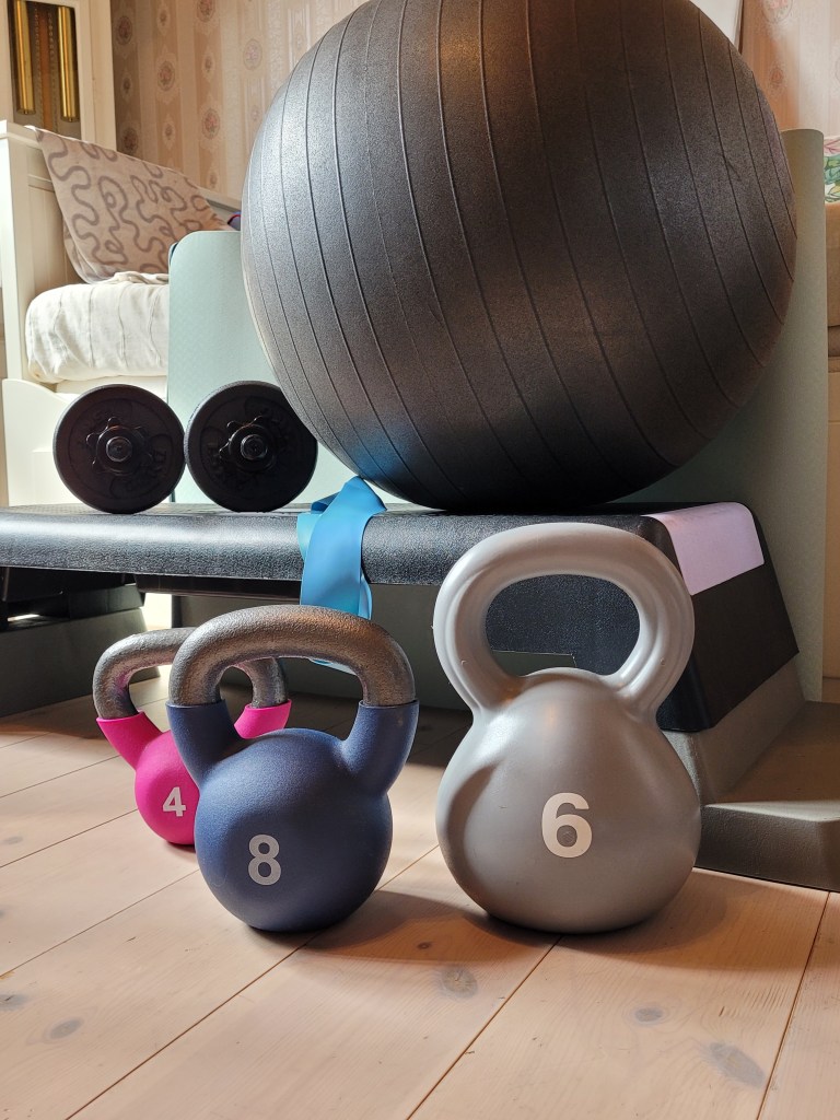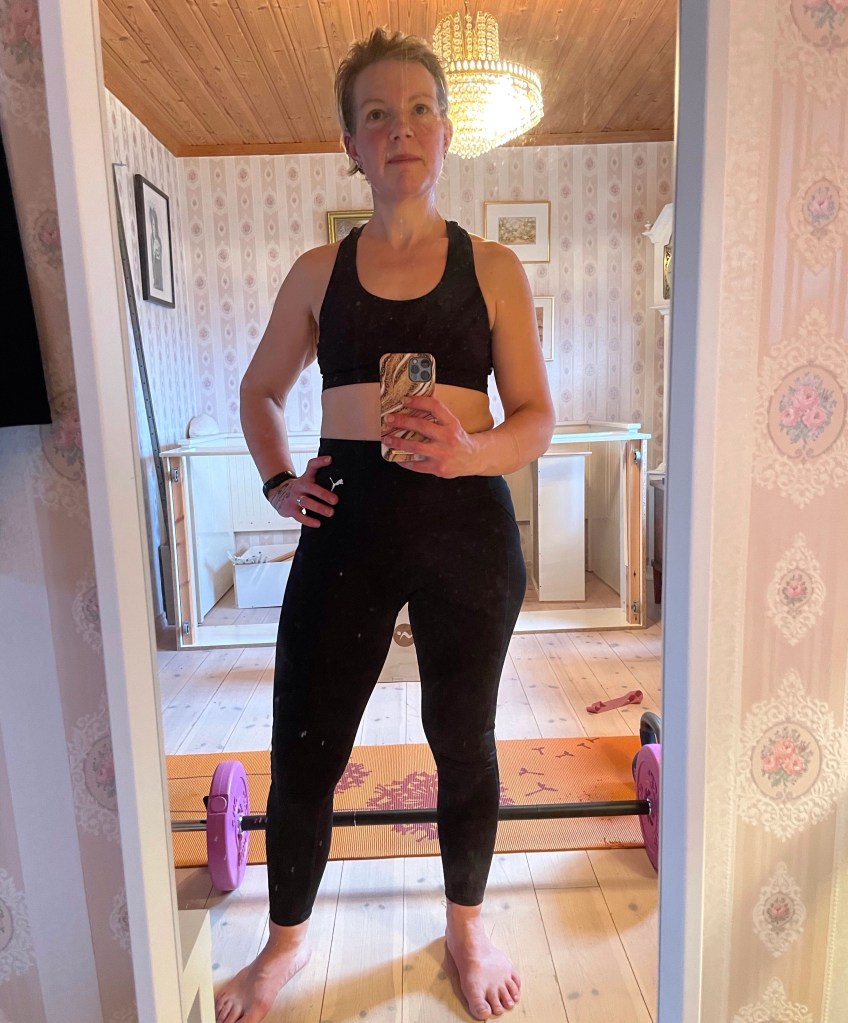 Så, det senaste året har verkligen varit en resa! Från att med ett set på 1 kg hantlar, 4 kg kettlebell, en stepbräda och ett lätt gummiband som sällskap på skakiga ben ta mig igenom pass efter pass, till att sakta avancera till att kunna lyfta upp mot 30 kg på stången när jag gör benpass känns helt fantastiskt! Jag kan se och känna att jag fått muskler, och även om jag är mitt i livet och andra dela på min kropp talar om för mig att jag börjar bli äldre (det börjar hänga nåt konstigt under hakan 🤣), så NJUTER jag av att känna mig stark, frisk och i min kraft! Jag har till och med börjar jogga lite smått, och det trodde jag inte skulle hända när jag började för ett år sedan!