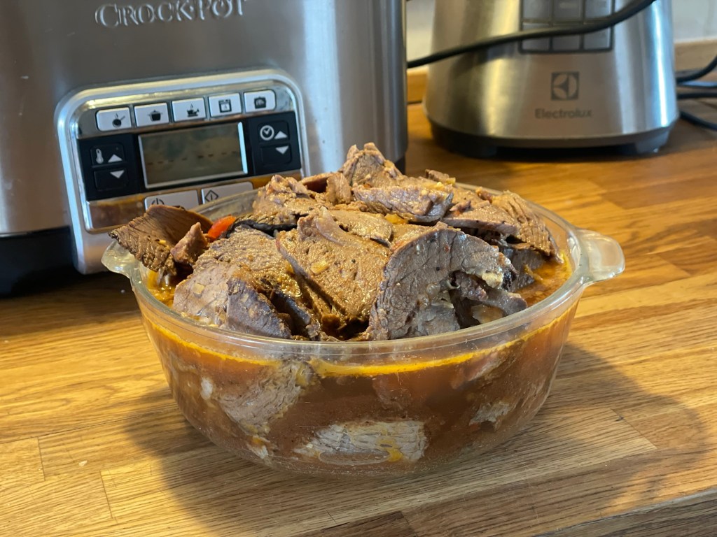 - Lägg köttet i en slow cooker på låg temperatur, (Ca 4 h för fläskkött och 6 – 8 h för nötkött)