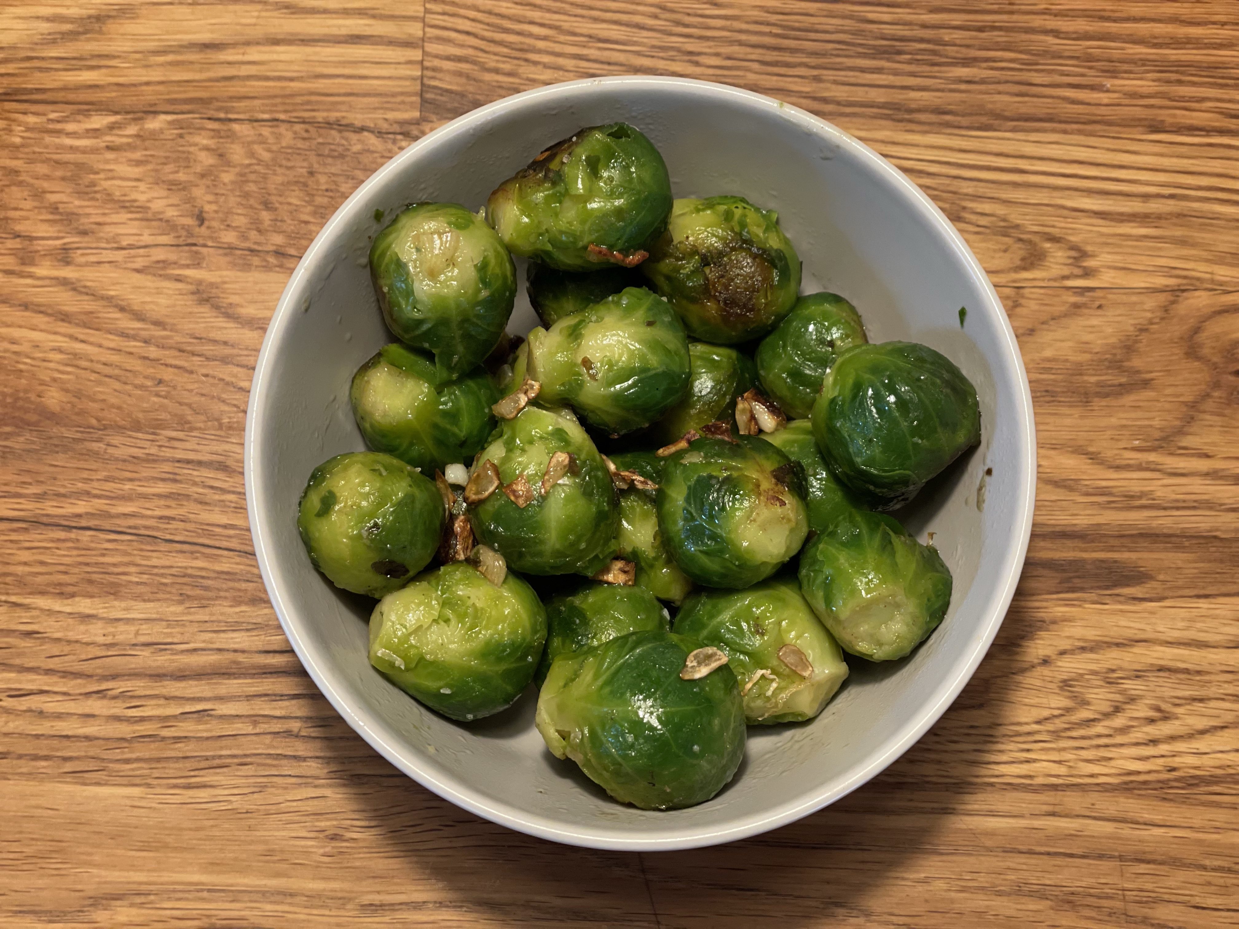 Stekt brysselkål Så här gör du: Koka upp ett paket fryst brysselkål Hacka och fräs under tiden 2 vitlöksklyftor Häll av vattnet av brysselkålen Bryn kålen till önskad färg tillsammans med vitlöken Kan serveras både varm och kall!
